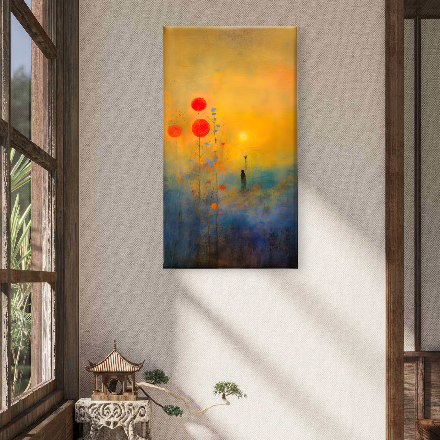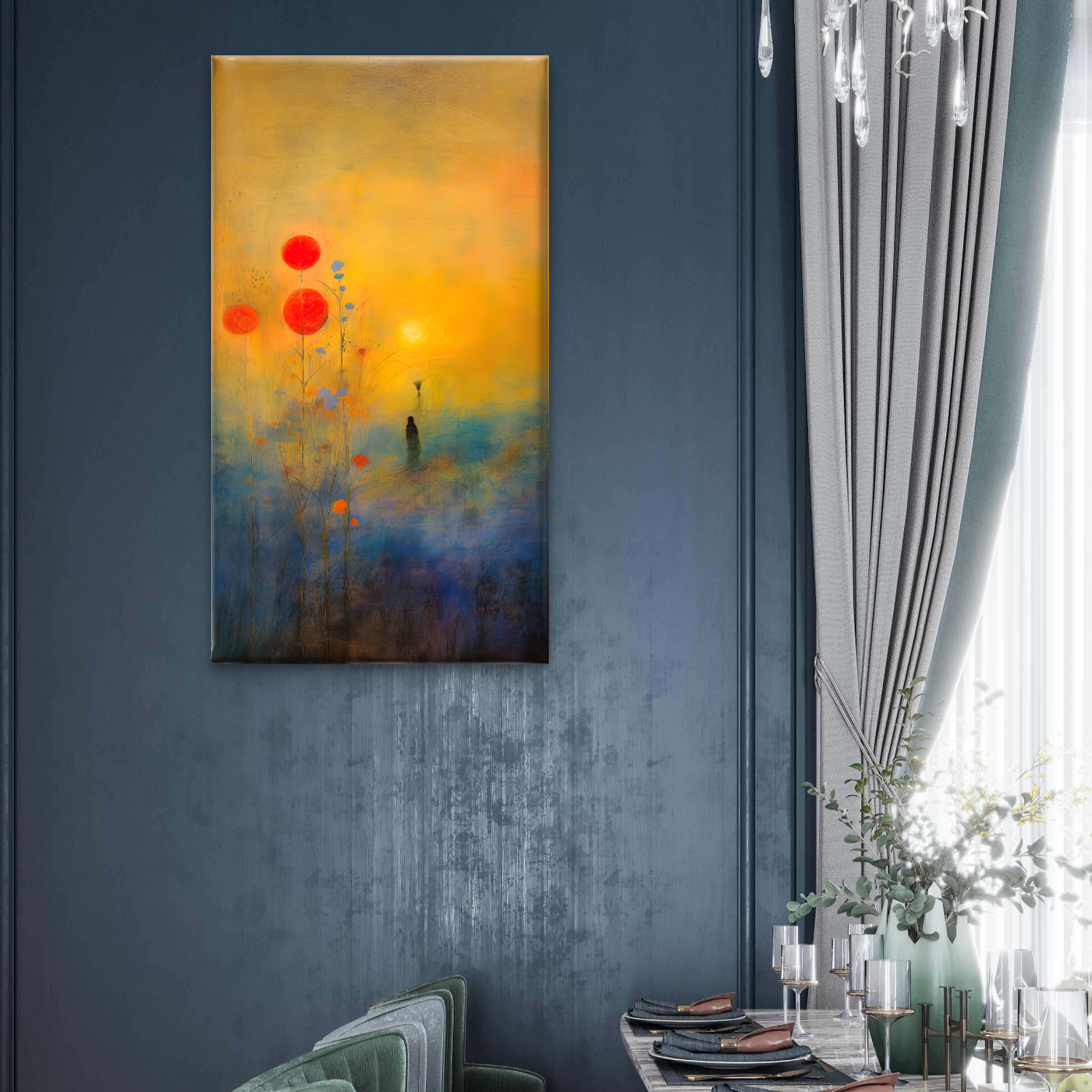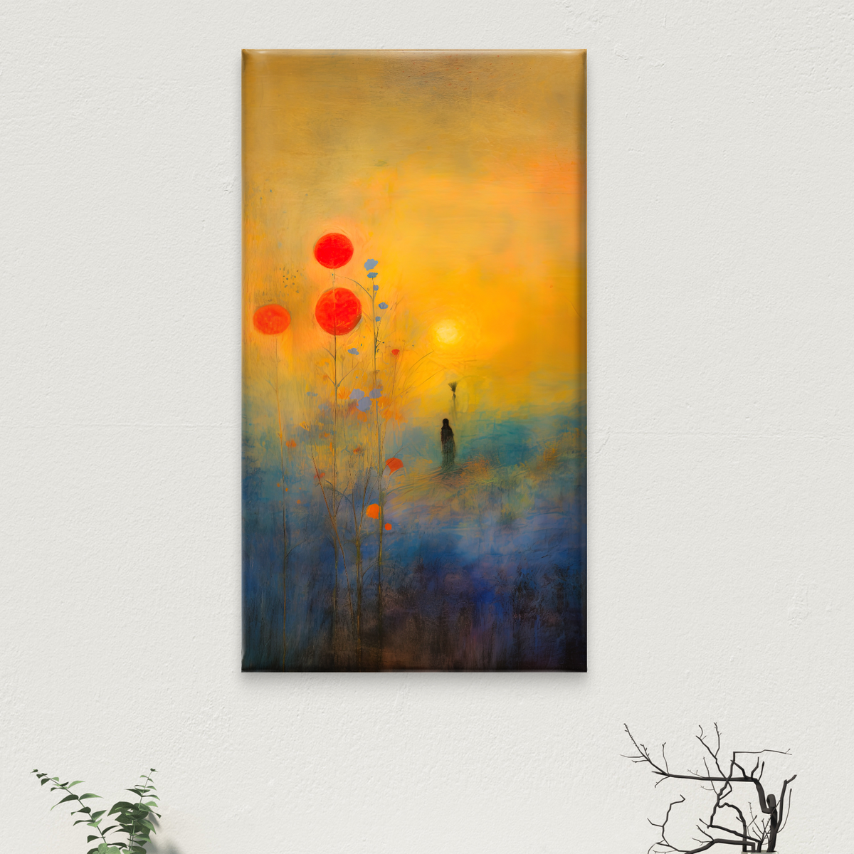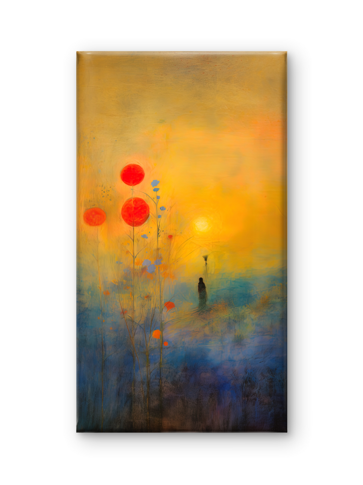 This unique canvas painting features a durable wood frame with a duco paint inner border in a sleek black finish. Designed in a rectangular portrait orientation, it is available in Small (12W x 18H"), Medium (18W x 24H") and Large sizes (24W x 30H") approximately weighing 500g to 1.5kg Each. Lightweight yet strong, perfect for your modern home décor.