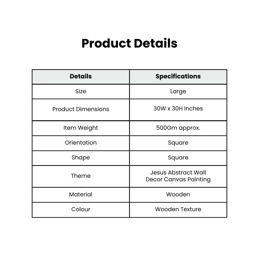 The 30W x 30H inch Jesus Abstract Wall Decor Canvas Painting (Large) brings an artistic and spiritual feel wherever it is displayed. The canvas painting has a square orientation and shape with a natural wooden frame in a wooden texture finish. At around 500g in weight, it adds elegance and stillness to the interior.