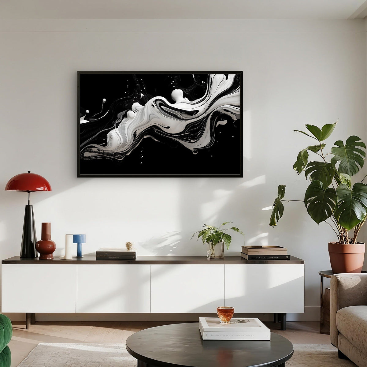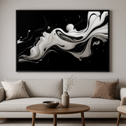 This oversized 36 x 24 inch wall canvas features an abstract dark design in a landscape shape and comes in a contemporary rectangular shape. Professionally produced using high-end printing on premium canvas and finished with a black engineered wood frame, this piece offers bold contemporary style to any room.
