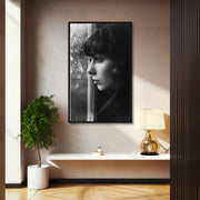 This oversized wall canvas, measuring 24x36 inches, has an abstract dark theme presented in a portrait orientation with an elongated rectangular shape. This canvas is printed on premium canvas and framed in conventional engineered wood with a black finish to make a bold modern statement in any room.