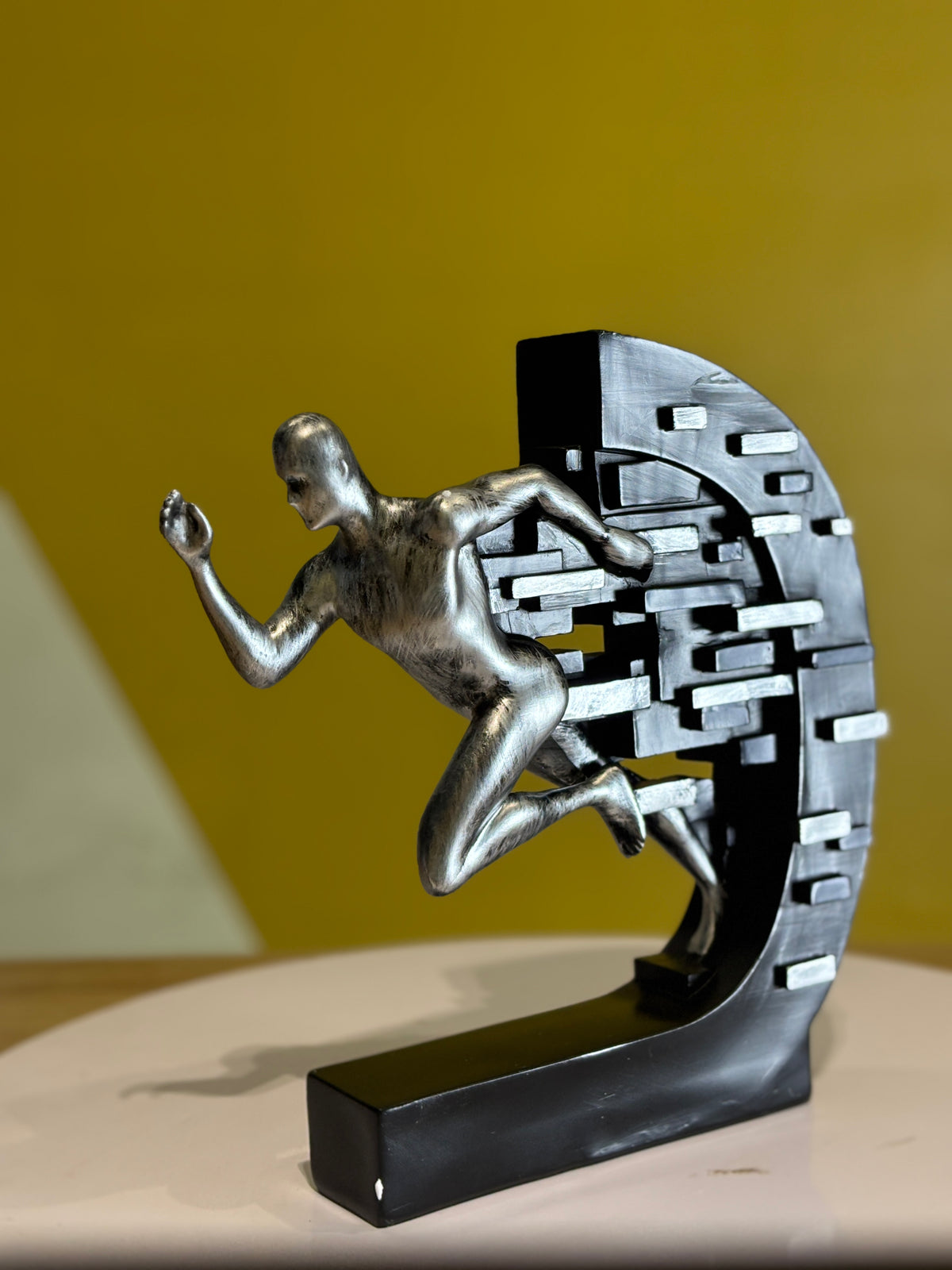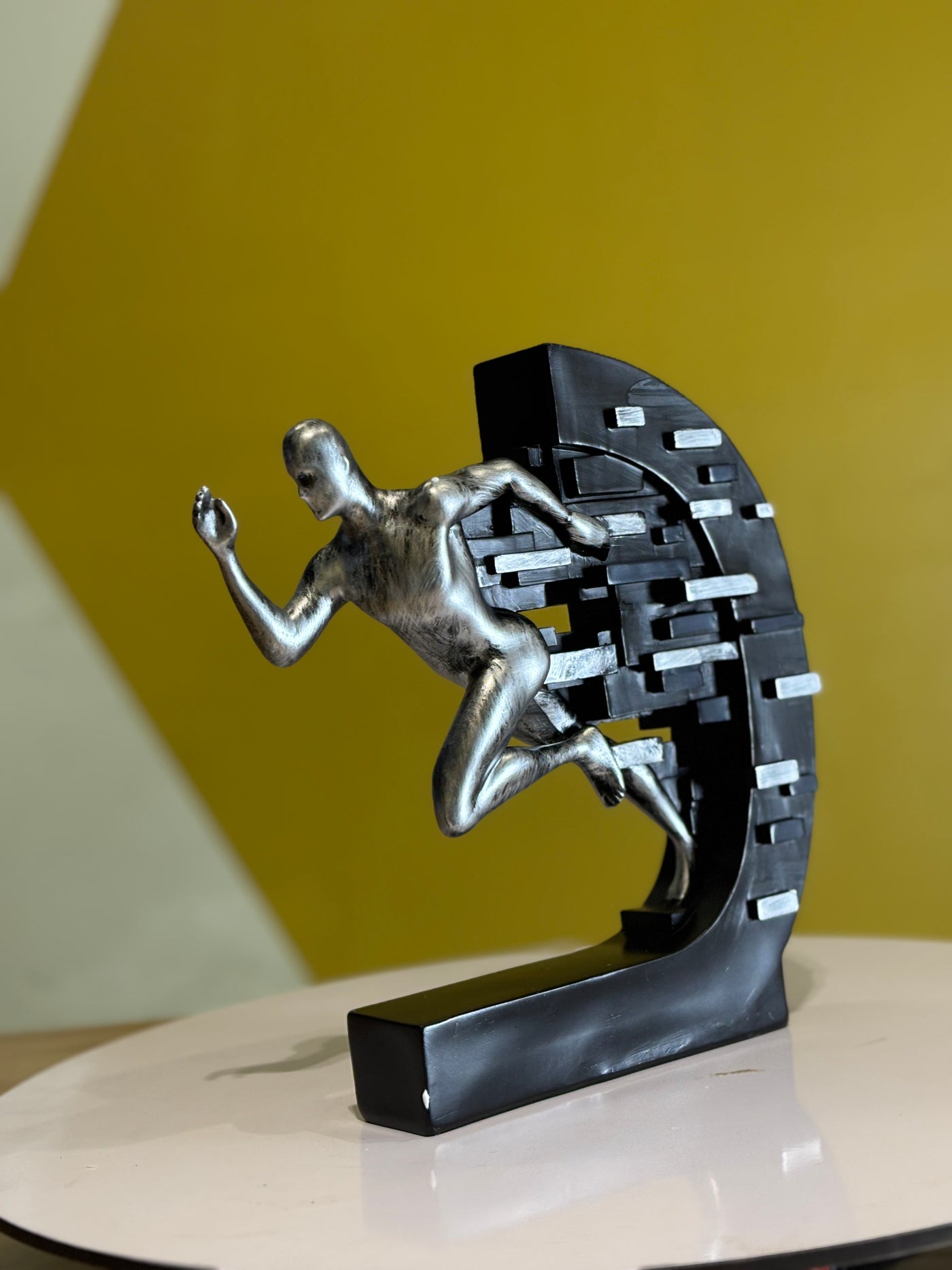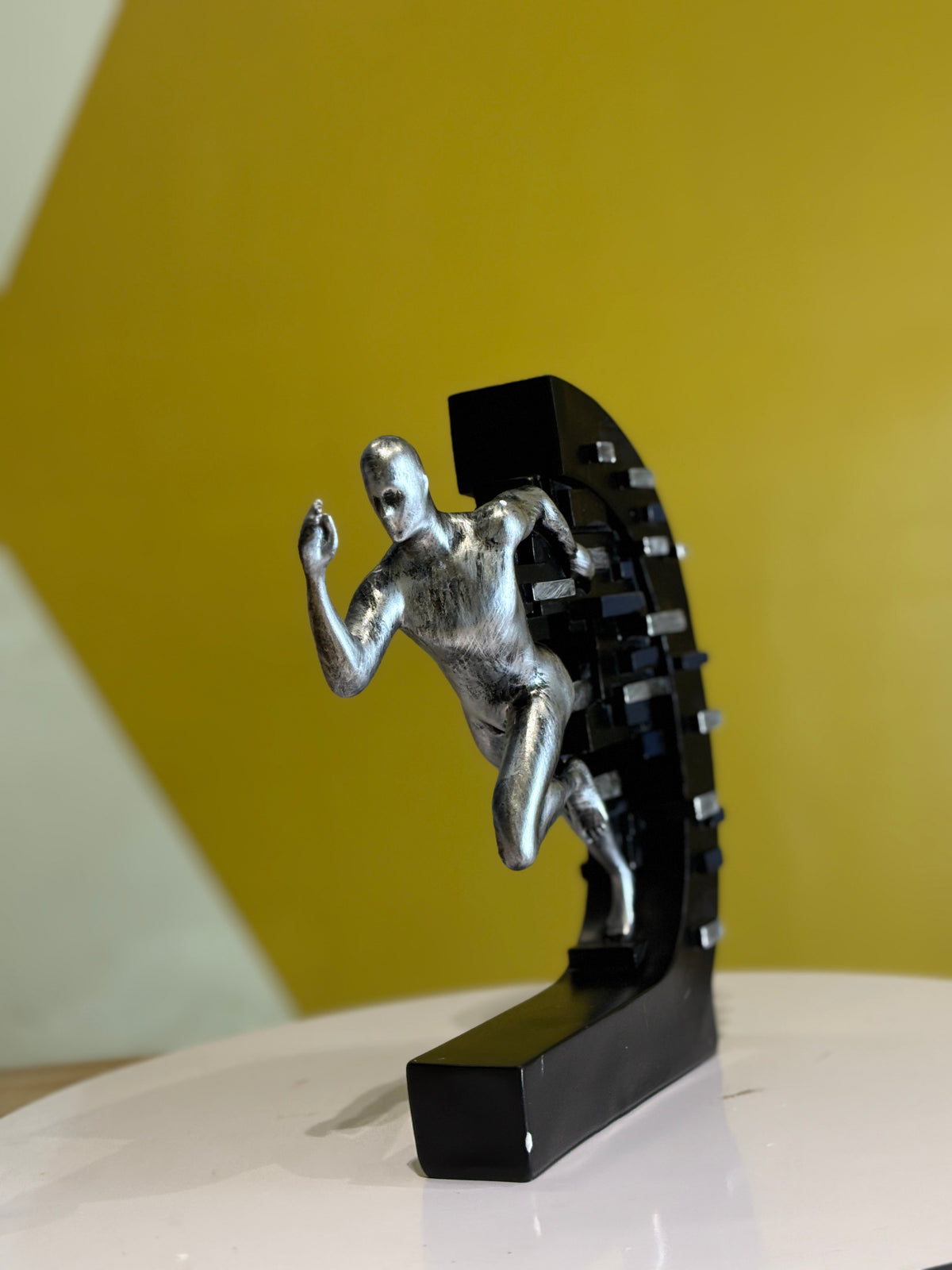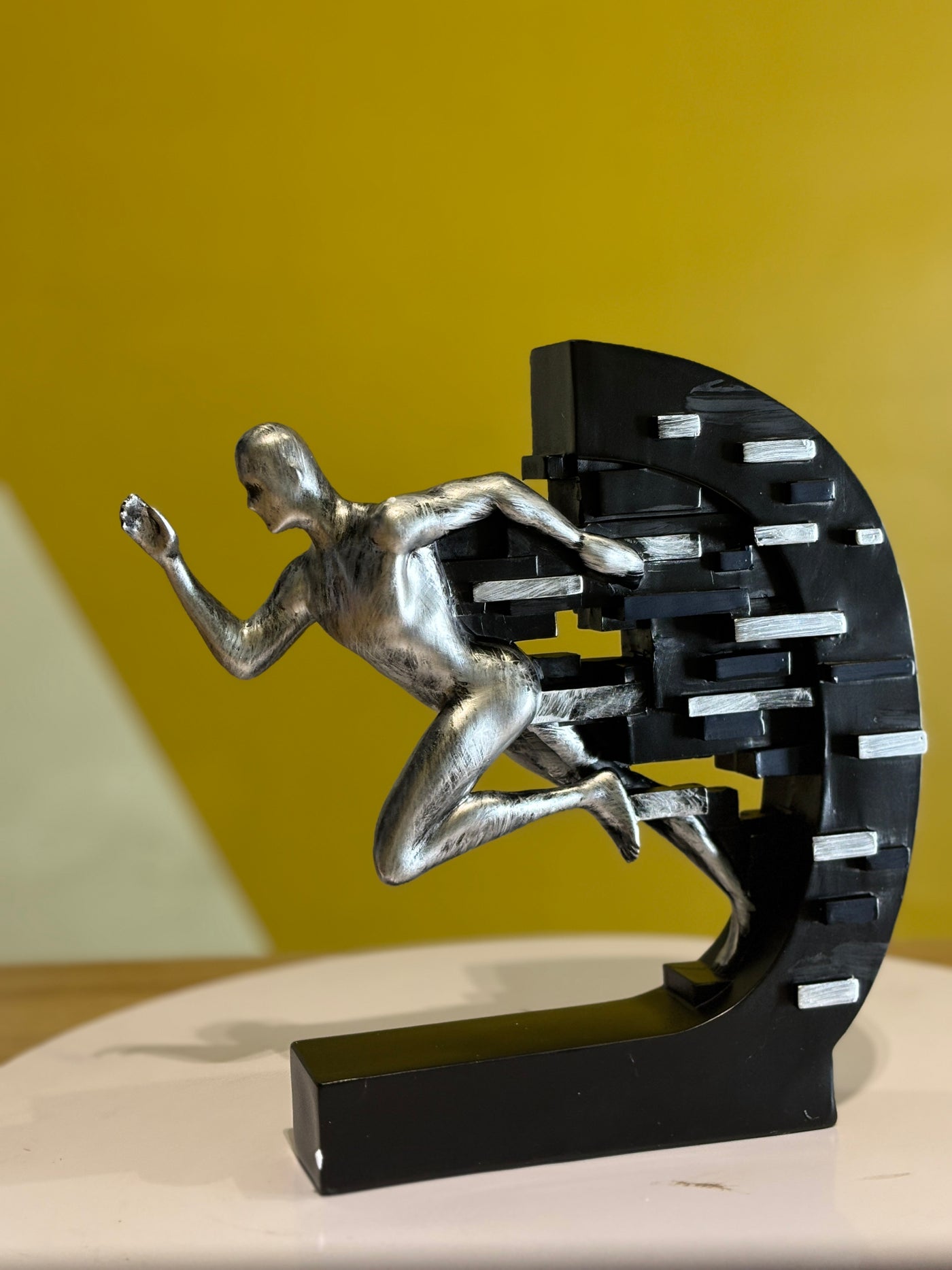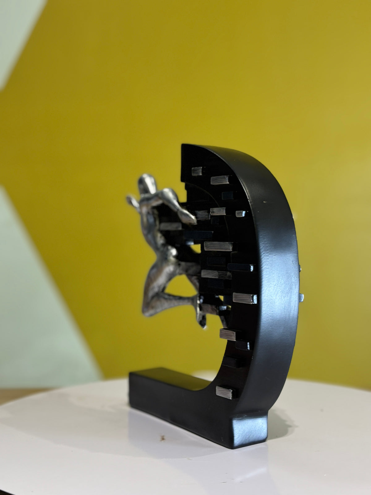 This is a medium-sized Basketball Player sculpture measuring 6W x 11H inches and weighing approximately 700gm. Crafted from imported clay with a golden metal brush finish, its qubical shape and portrait orientation on a sleek black frame exude energy and elegance, perfect for sports enthusiasts.