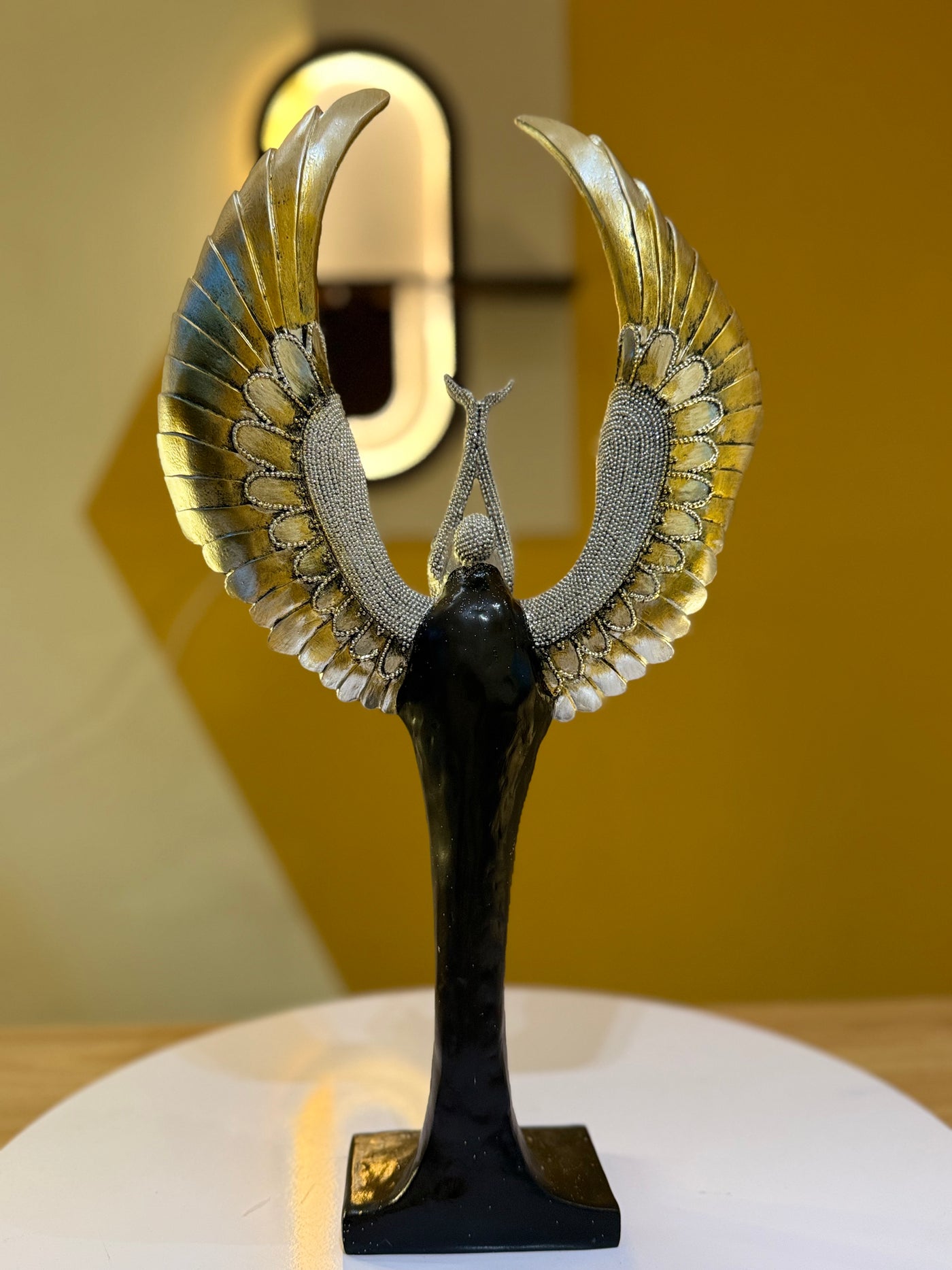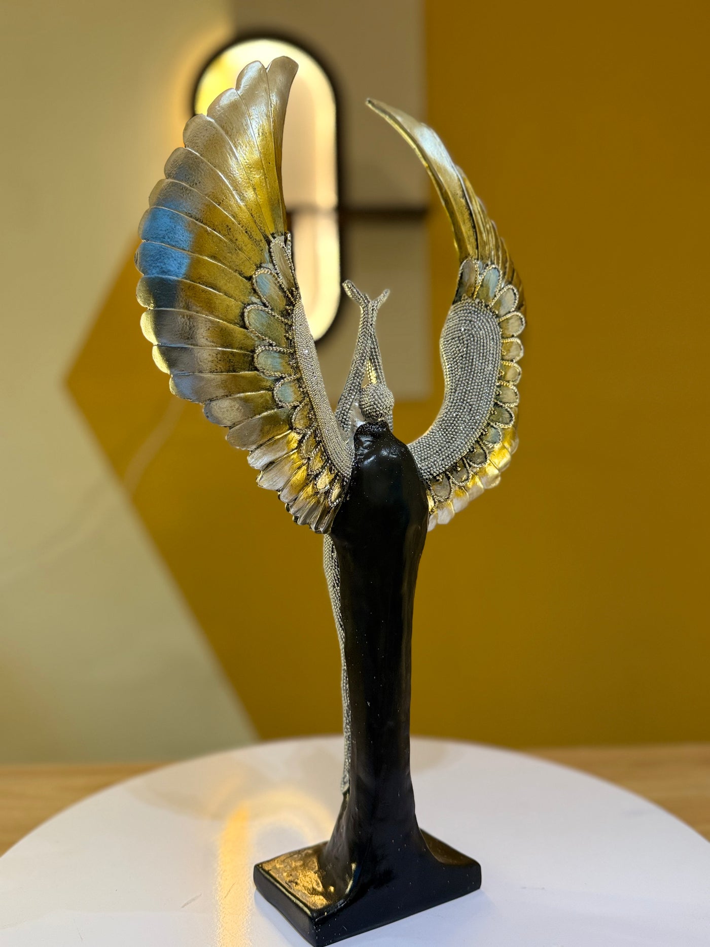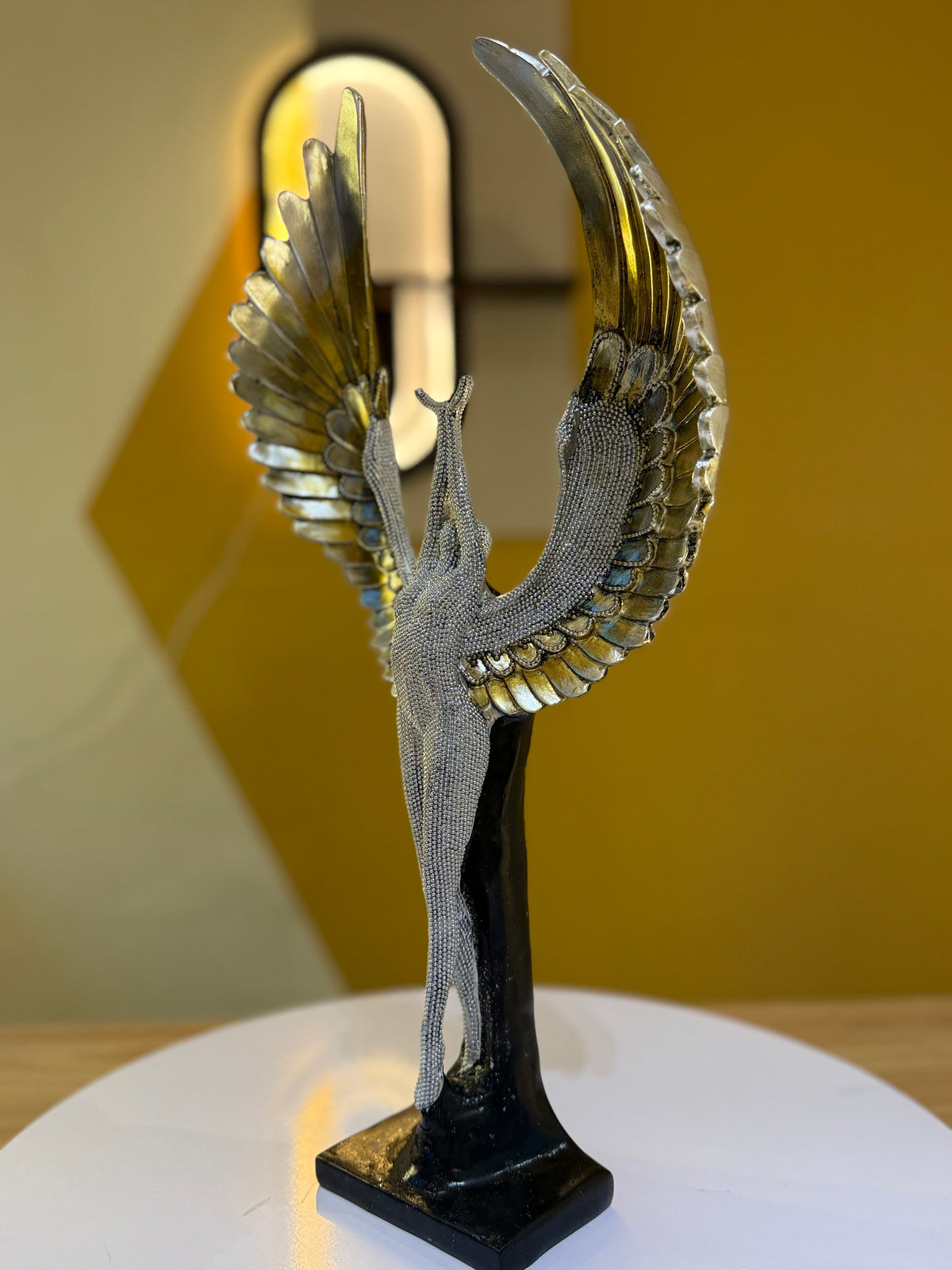 A silver fairy girl with golden wings is depicted in a qubical design on this medium 10W x 19H inch portrait artwork. Its multicolored frame exudes elegance and is a captivating decorative centerpiece, crafted from imported clay with silver diamond accents and black-golden brushed paint.