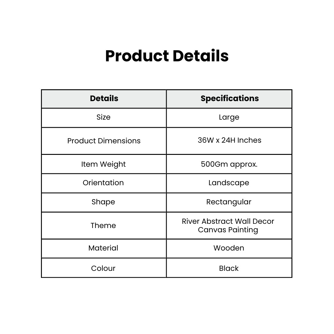 Elevate your home or office with this River Abstract Wall Art Canvas Painting, available in the size of 36W x 24H inches. A calm modern look for any space, this painting is designed to hang in landscape orientation (rectangular). It presents a black engineered wood frame and is approximately 1kg in weight. The perfect painting addition, it offers elegant contemporary style to your wall.