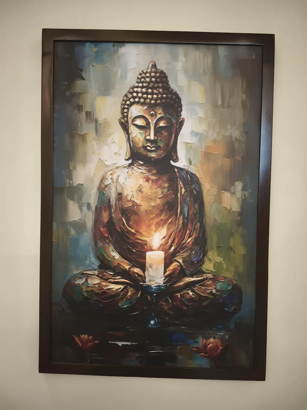This Buddha Abstract Wall Decor Canvas Painting is medium in size (20W x 30H inches) and will bring a peaceful and spiritual element to any space. Presented in portrait orientation and a rectangular shape, it comes framed in a natural wood frame that features a wooden texture. All while being lightweight, only approximately 500g it brings calmness and elegance to the interiors.
