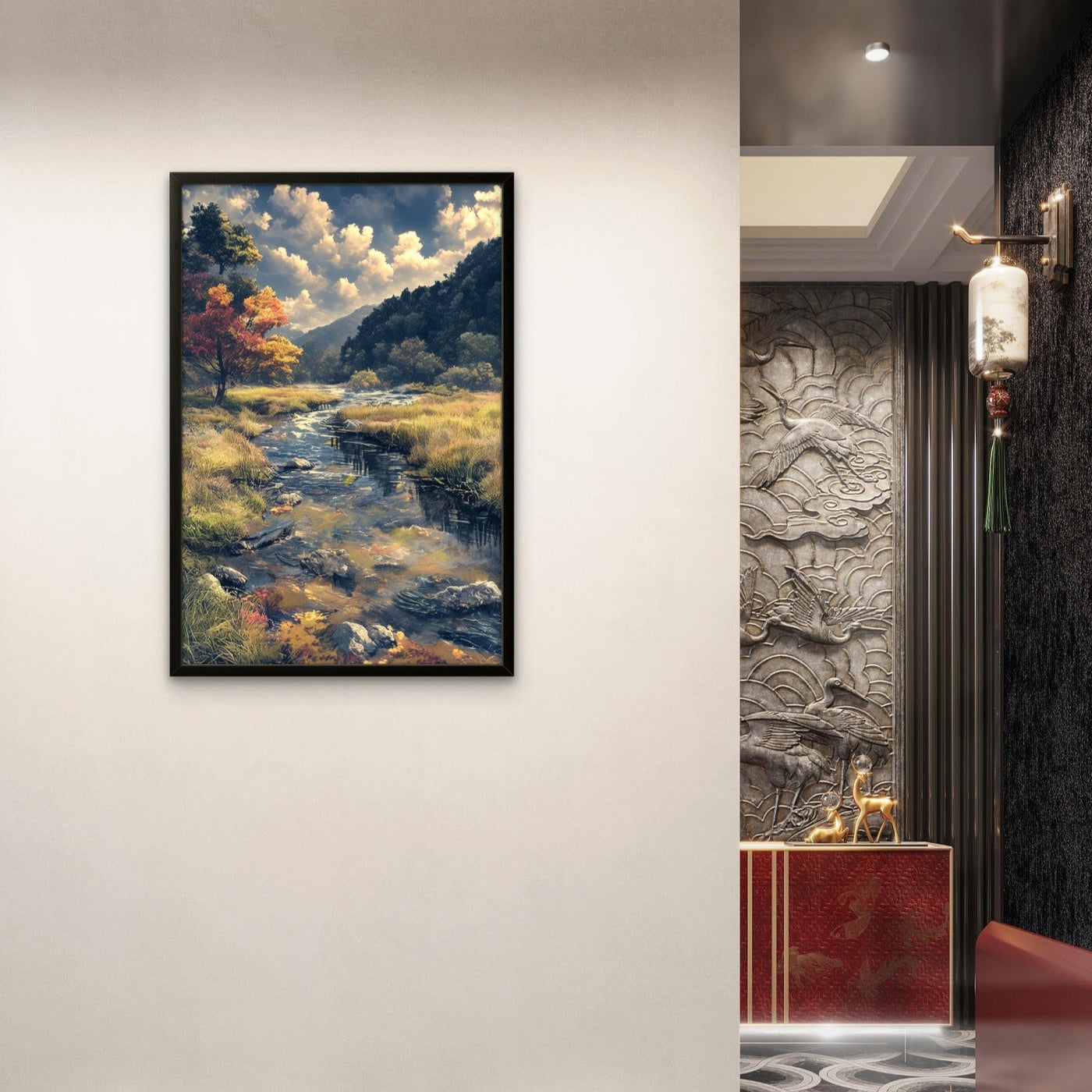 The River Abstract Wall Decor Canvas Painting in the medium size (18W x 24H inches) adds a relaxing and artistic touch to a space. The painting is portrait-oriented, framed in a black engineered wood frame and is lightweight, it's just under 500g. More modern elegance and calming visuals for the indoors.
