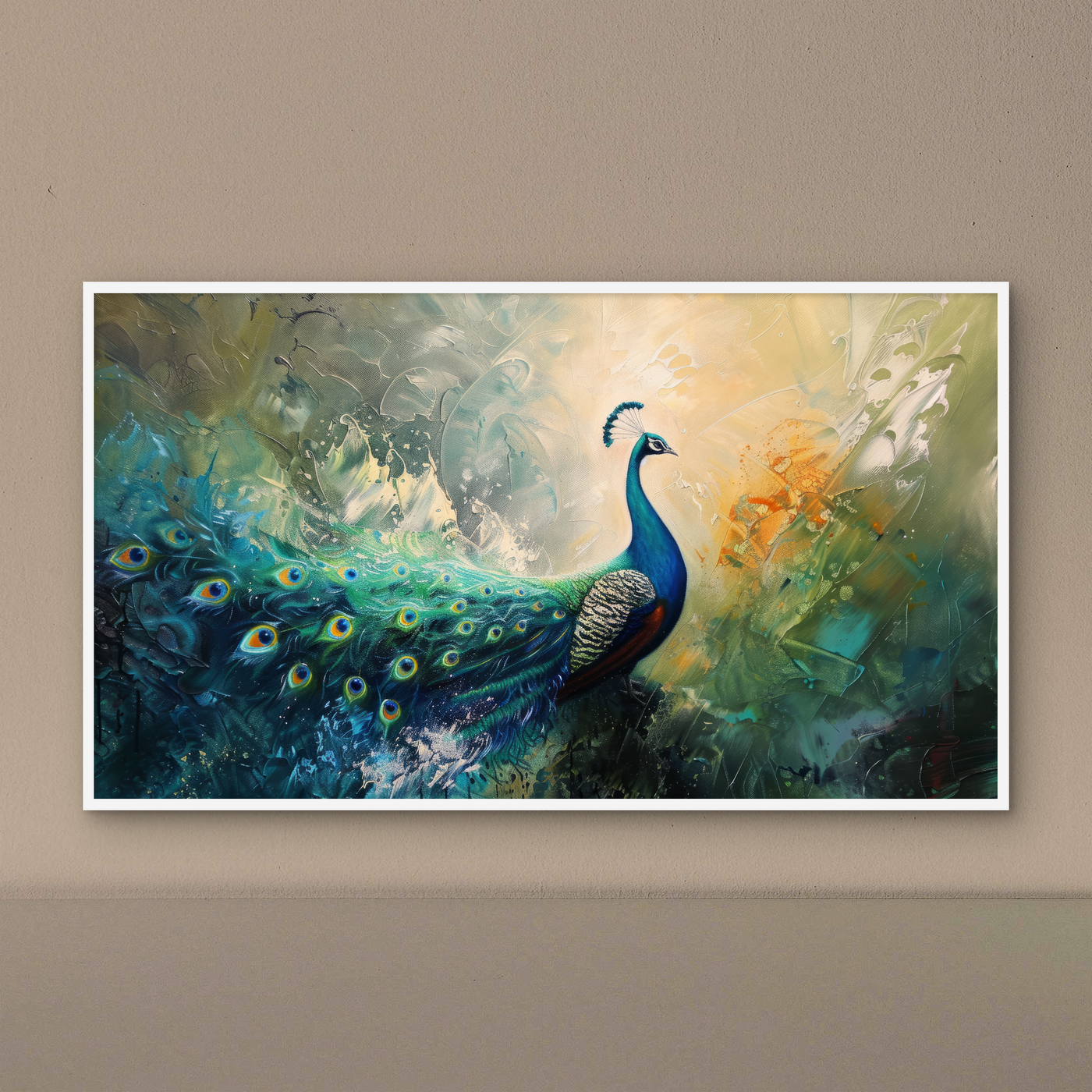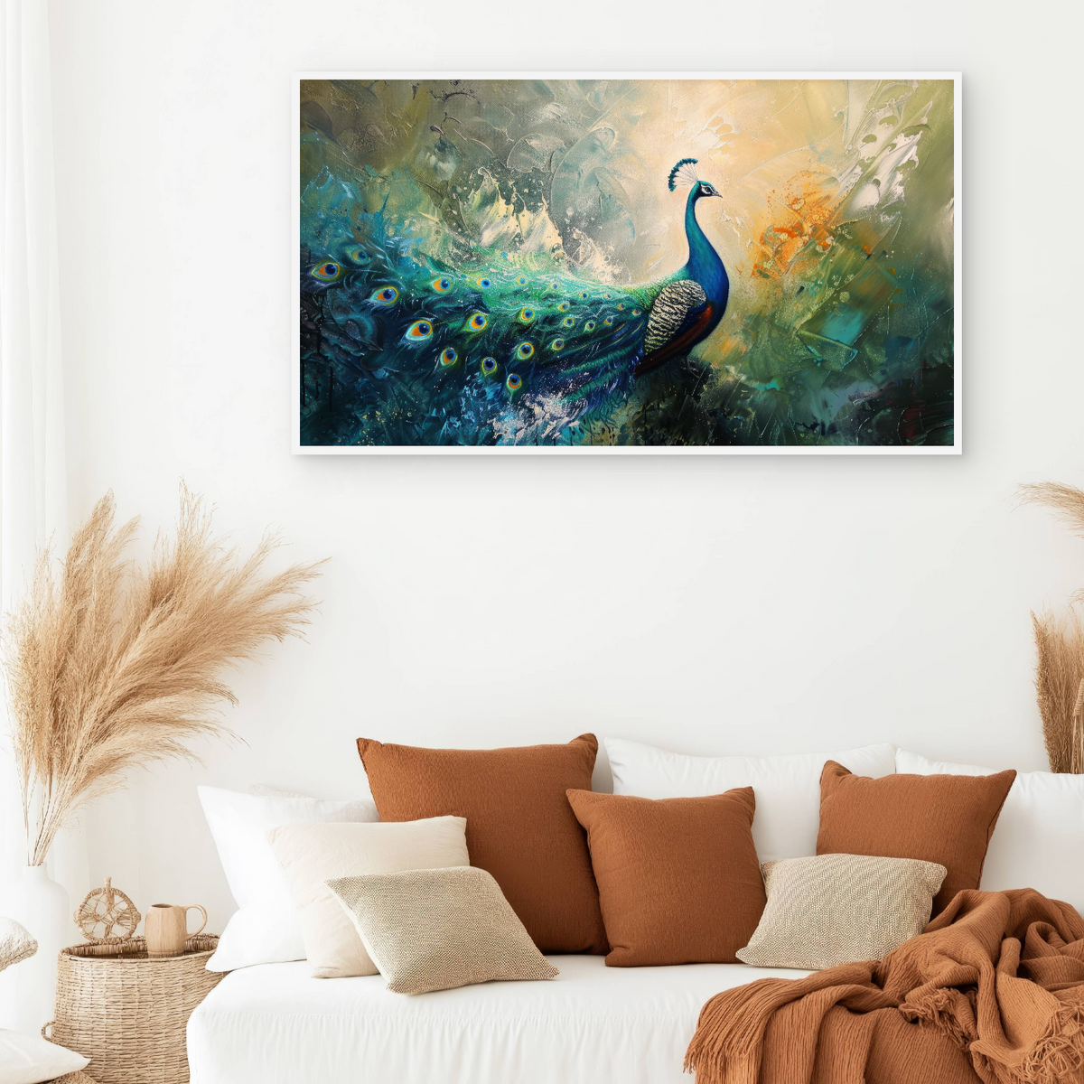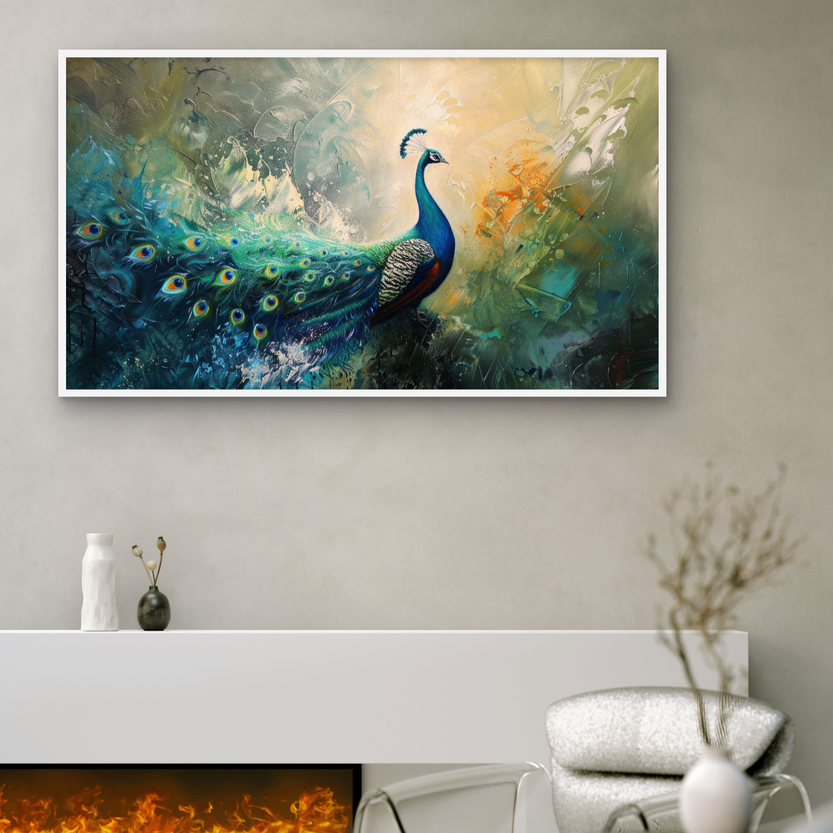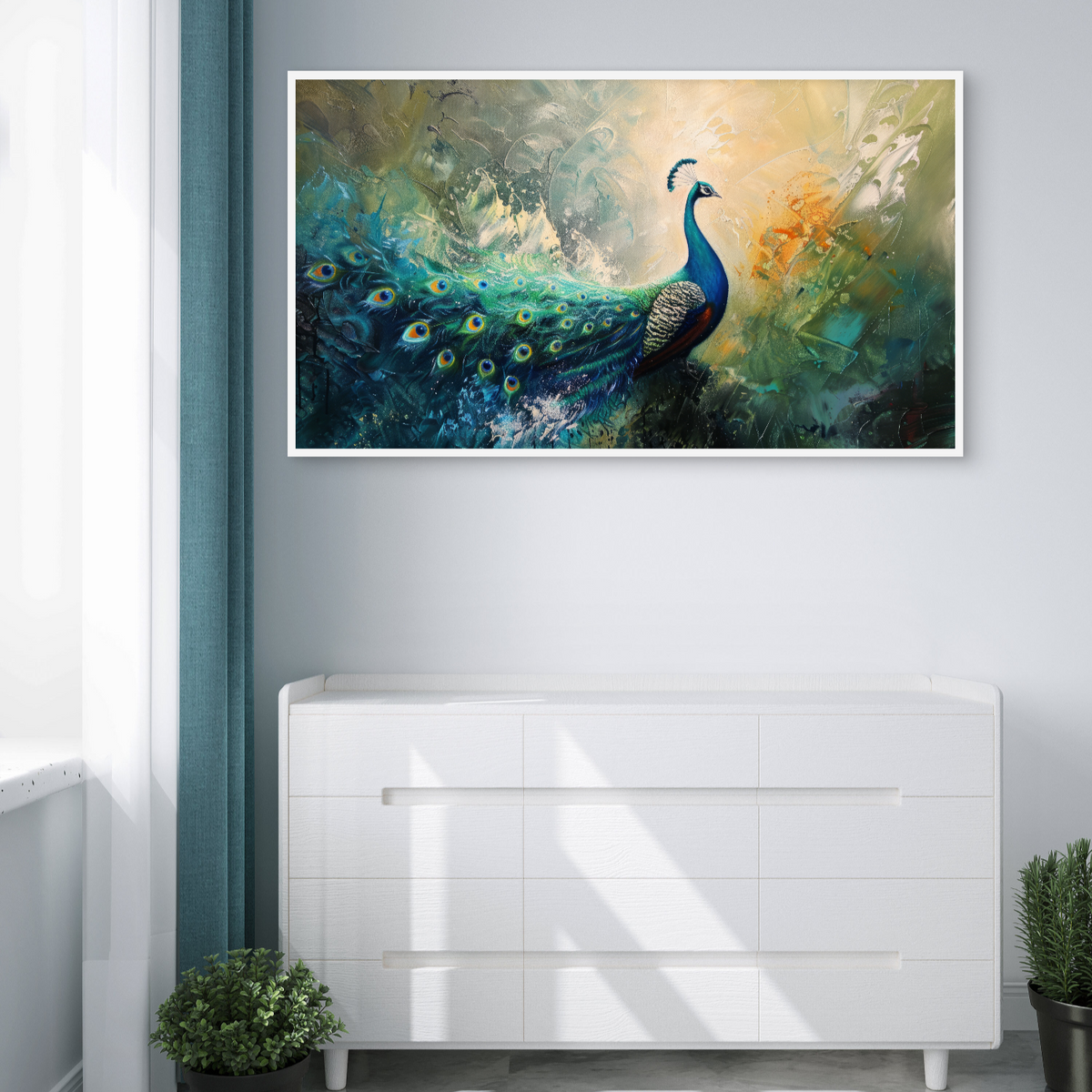 This Peacock Modern Art Canvas Painting boasts colorful 3D-printed, high-quality canvas in a framed white wood. Landscape-oriented and rectangular shape, this piece provides a style and color range that can be enjoyed in any living room, bedroom, or office space, as it dresses your walls with attention-grabbing imagery.