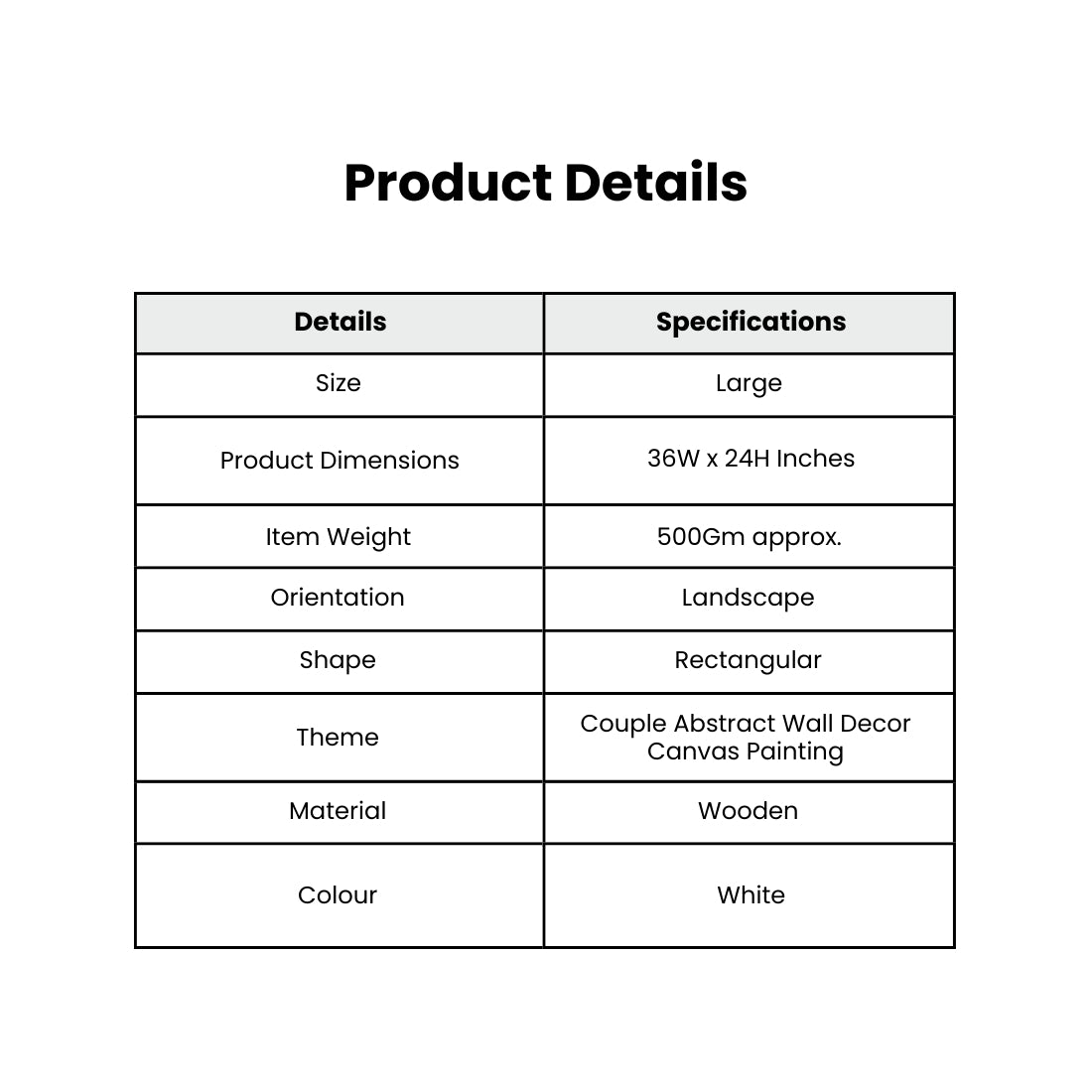 This Couple Abstract Wall Decor Canvas Painting in large size (36W x 24H inches) is designed in a rectangular landscape format. Featuring a contemporary couple-themed artwork, it comes with a sturdy engineered wood frame in white finish. Weighing around 1kg, it enhances interiors with elegance and artistic charm.